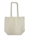 Midweight 100% recycled canvas. Fabric is 75% recycled cotton and 25% recycled polyester. 32 long self-fabric handles with 16 drop. Gusset bottom.Non-branded label/tag. Size: 17.75w x 15.75h x 6.25d.